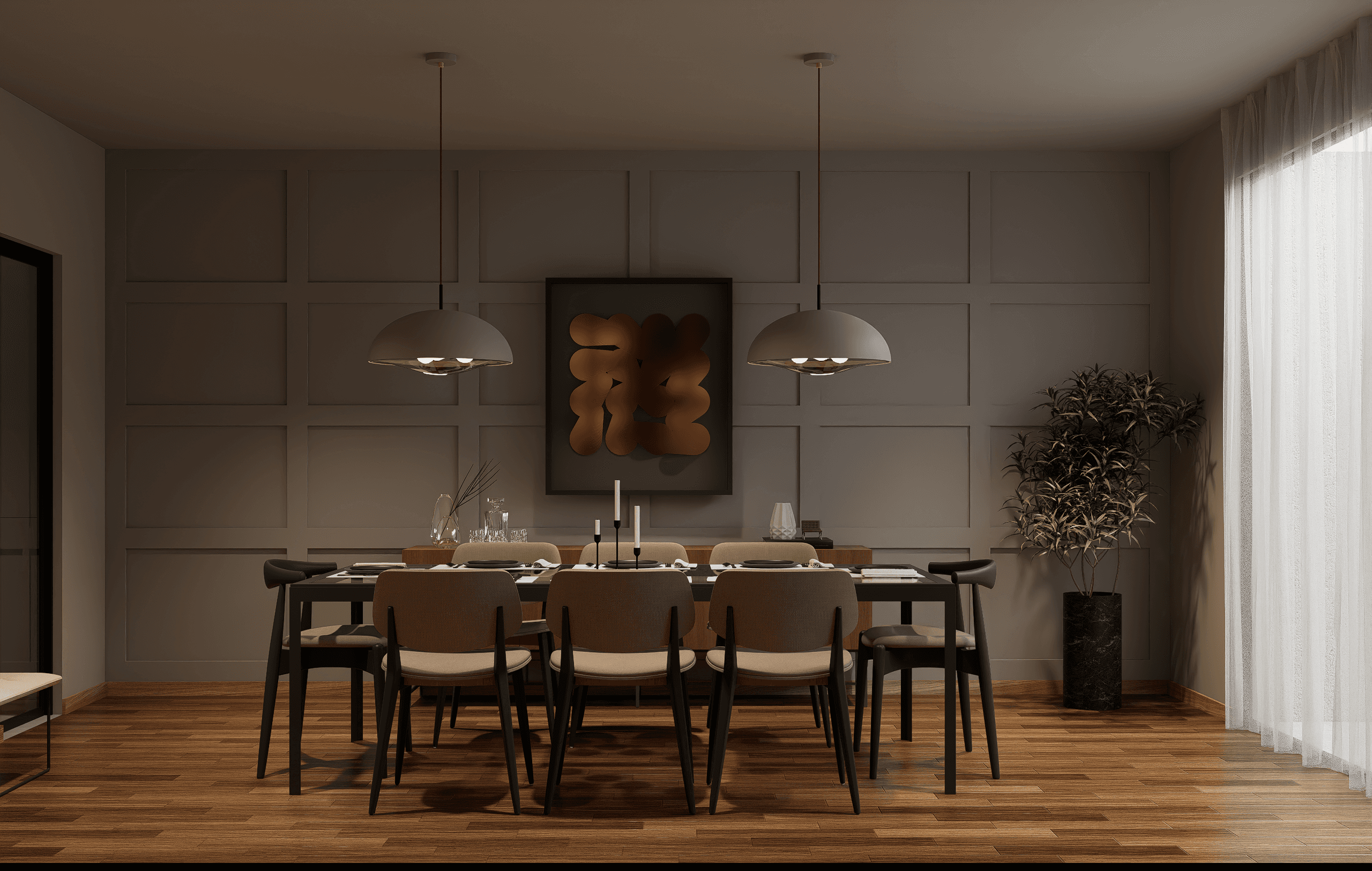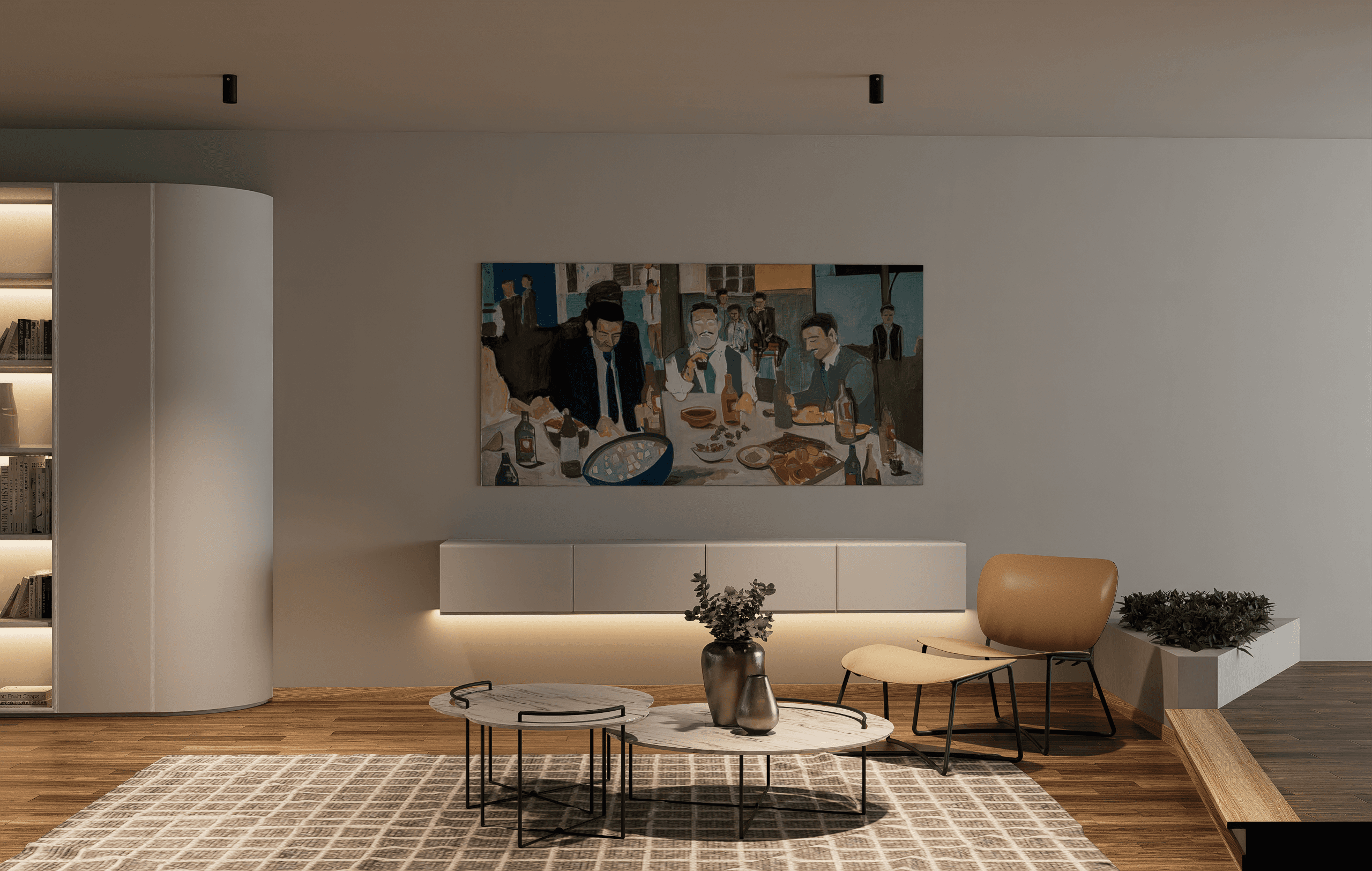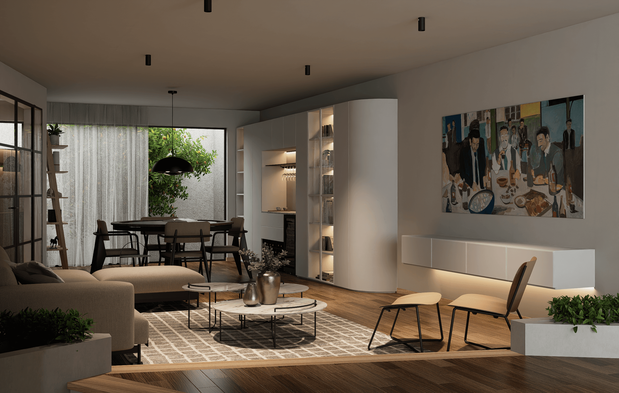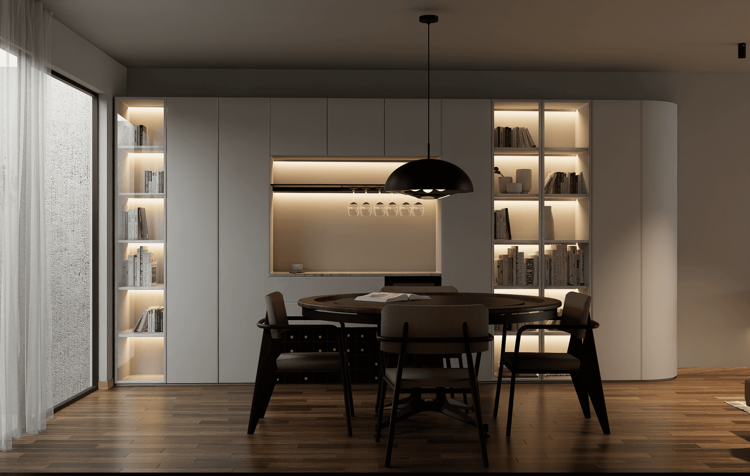 Este proyecto fue diseñado para equilibrar calidez, sobriedad y funcionalidad. La iluminación ambiental, cuidadosamente distribuida, suaviza los volúmenes y realza la arquitectura del espacio. El resultado es un hogar contemplativo y armonioso, donde cada detalle ha sido diseñado para invitar al descanso, la conexión y el disfrute cotidiano.