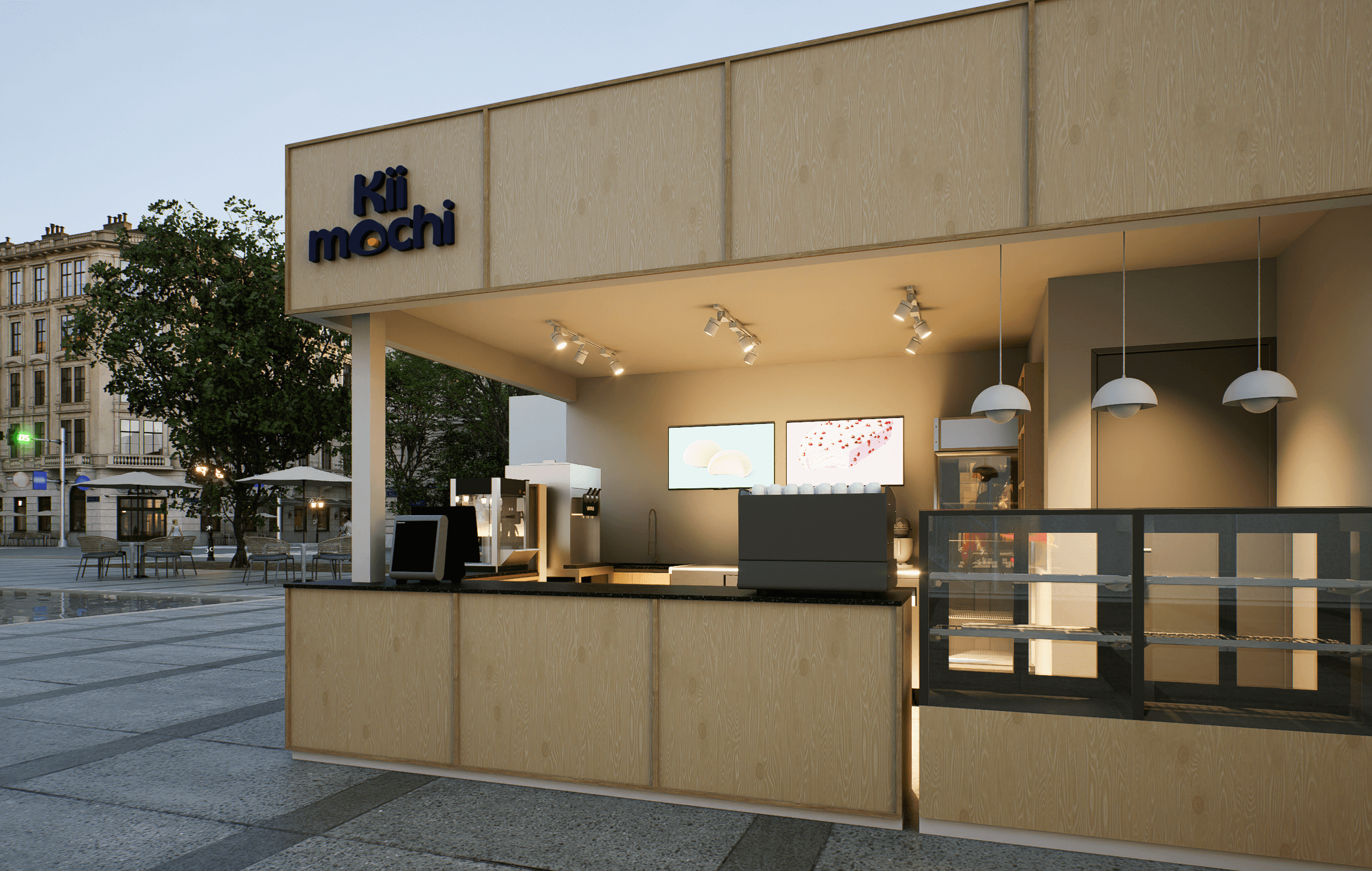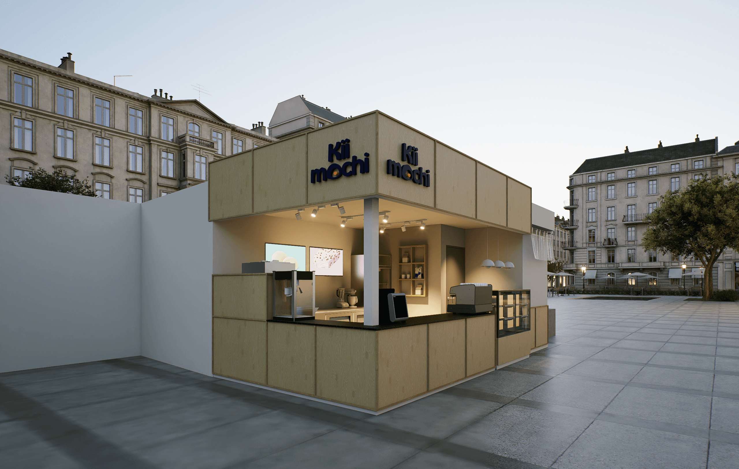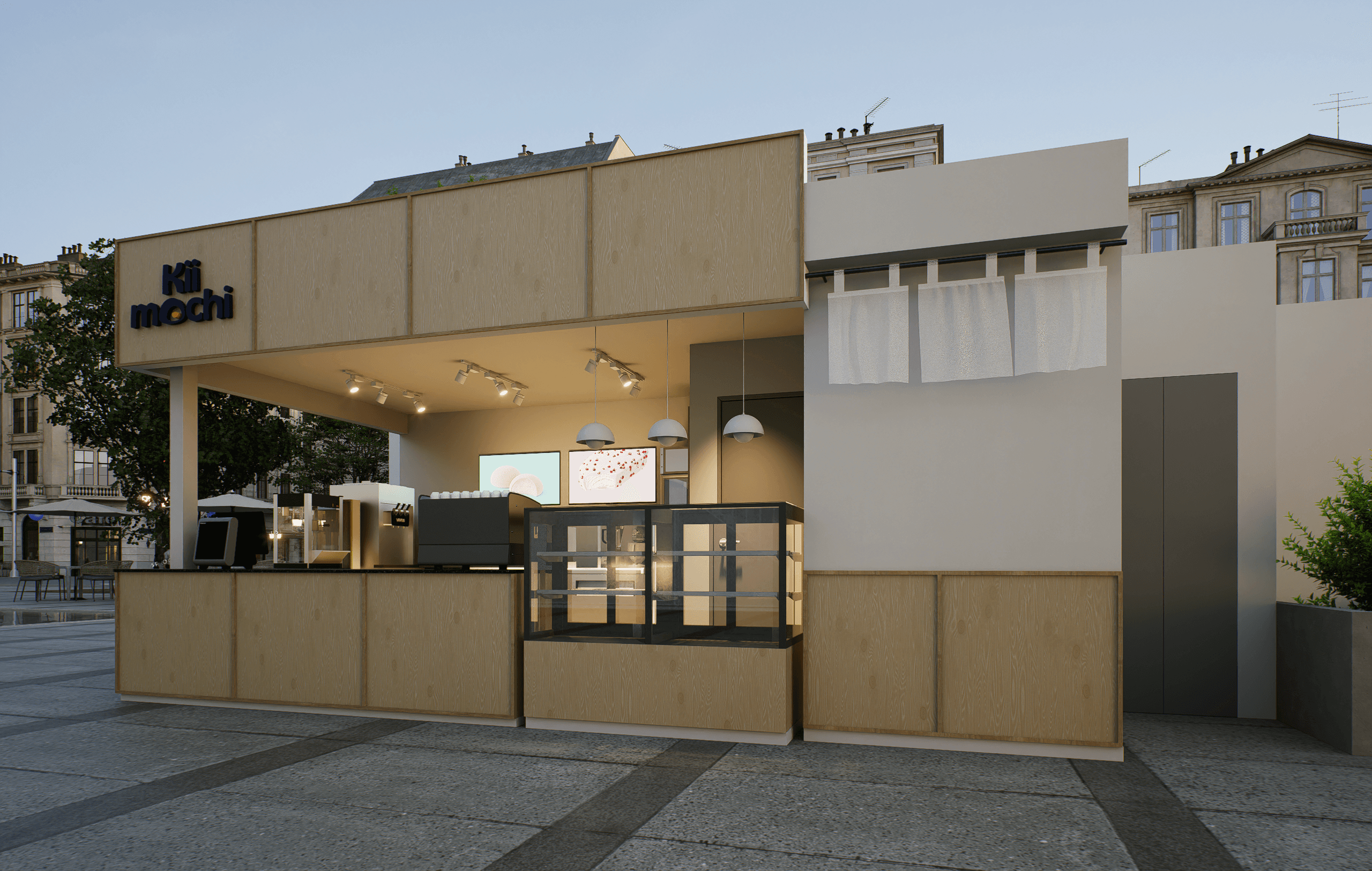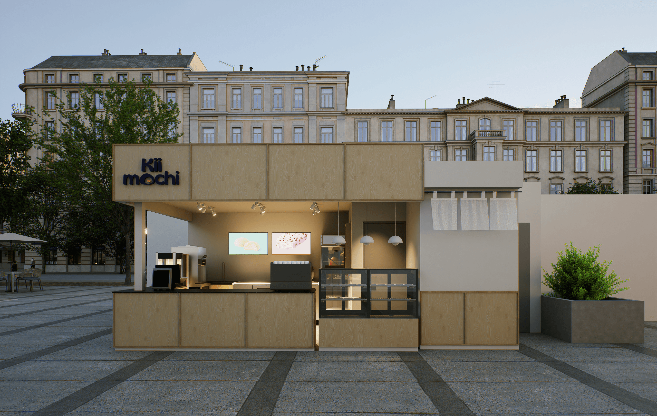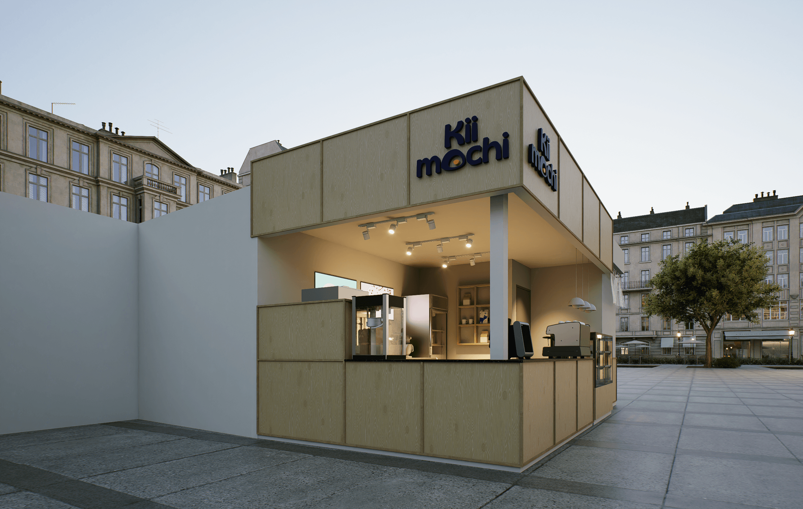 Concebido como una cafetería compacta de inspiración japonesa, el módulo de KiiMochi combina simplicidad, funcionalidad y una estética cálida que comunica la esencia de la marca. El diseño parte de un volumen limpio en madera clara, que aporta serenidad y naturalidad, contrastando suavemente con el entorno urbano que lo rodea.